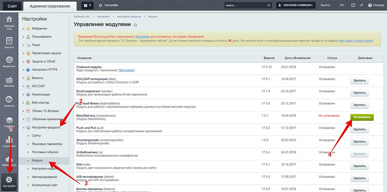 скачать модуль1. Сначала скачайте плагин по ссылке выше. Далее нужно разархивировать модуль в ваш 1C-Bitrix в папку "bitrix->modules". Далее вам нужно активировать модуль. Для этого вам нужно зайти в "Настройки->Модули" и нажать "Установить".