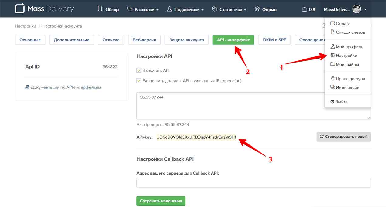 3. После этого Вам необходимо привязывать данное расширение к Вашему авторскому аккаунту на сервисе MassDelivery. Для этого сначала скопируйте Ваш API-ключ из настроек Вашего авторского аккаунта в буфер обмена (выделить и CTRL+C)