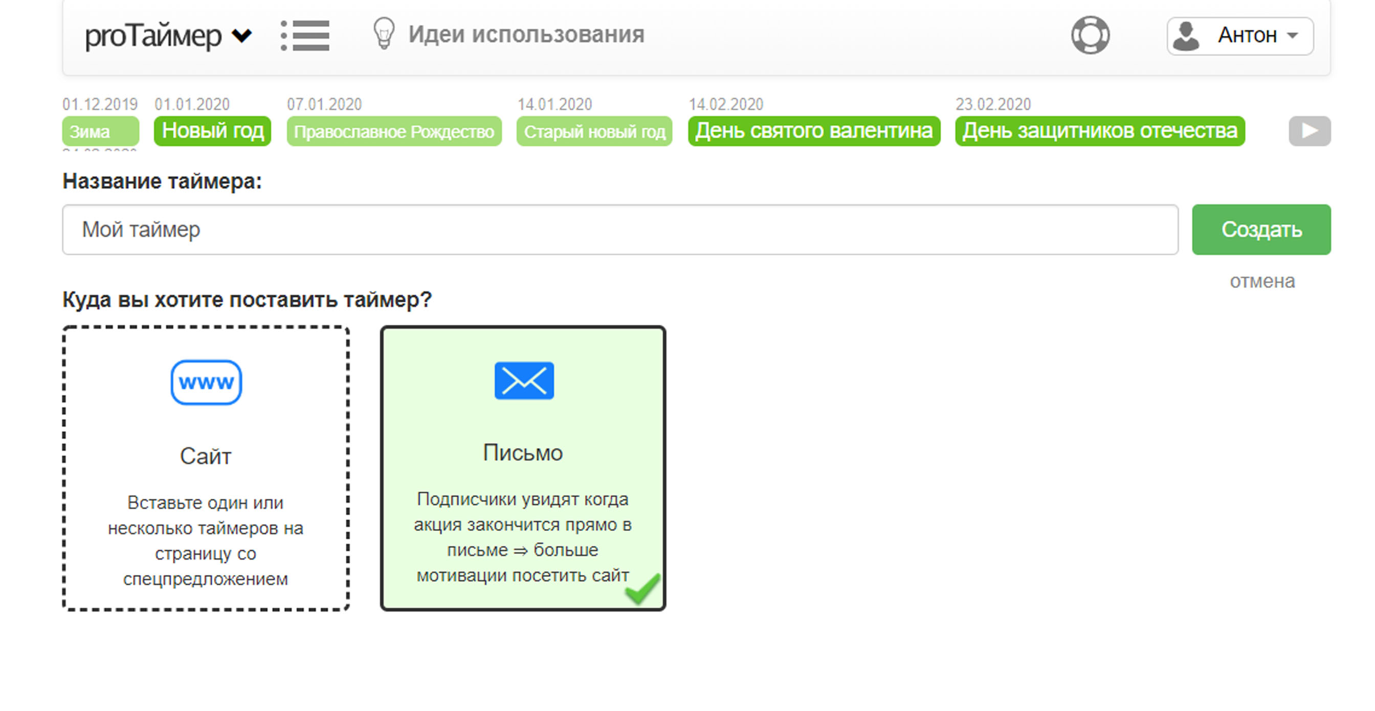 1. Войдите в ваш аккаунт proTimer, и нажмите на кнопку "Создать новый таймер". Введите название и выберите что хотите вставить таймер в письмо.