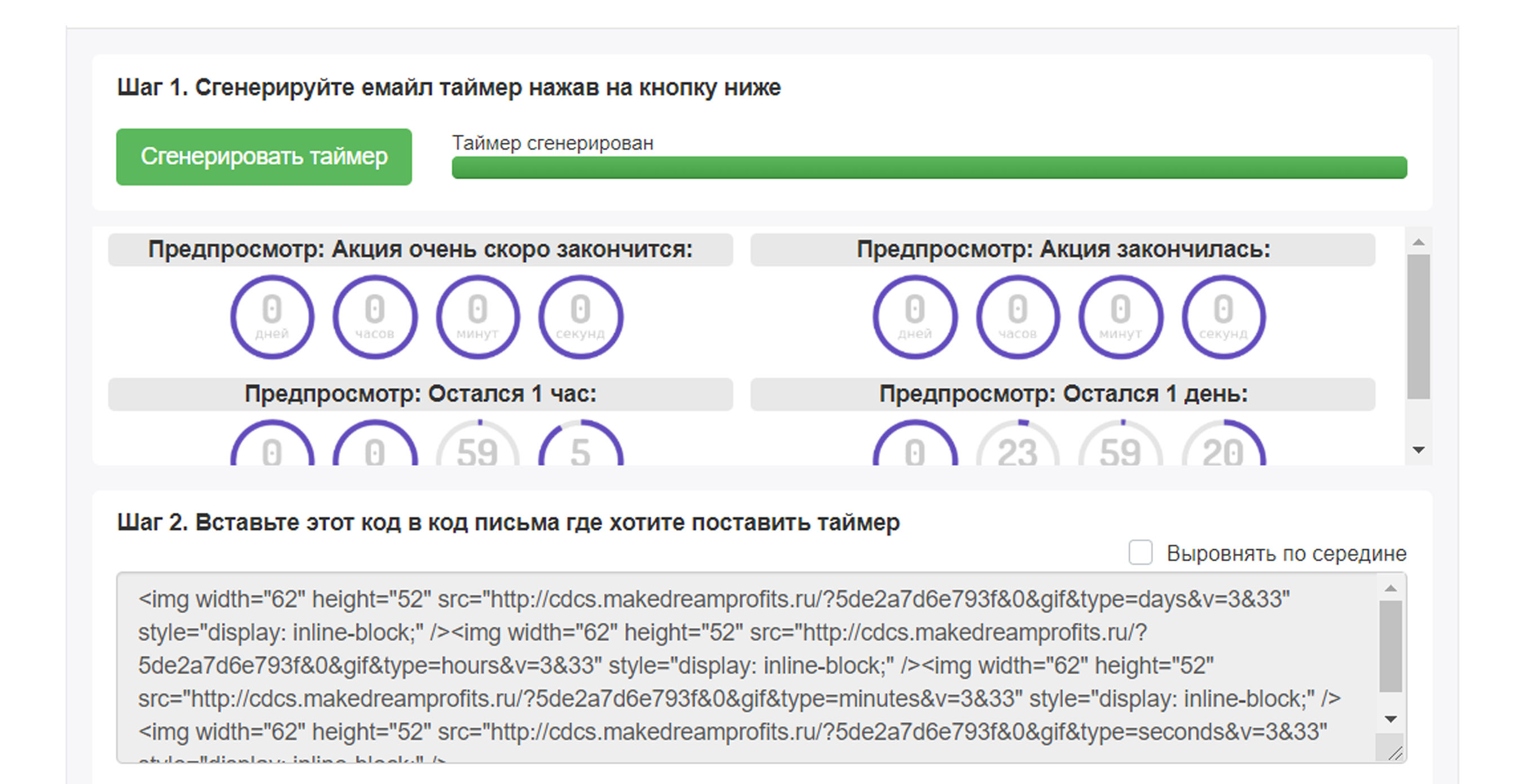 2. Нажмите "Сгенерировать" и подождите пока появится код таймера. Далее вставьте полученный HTML код в ваше письмо на MassDelivery, в упрощенном редакторе используйте кнопку "Source", в блочном блок html.