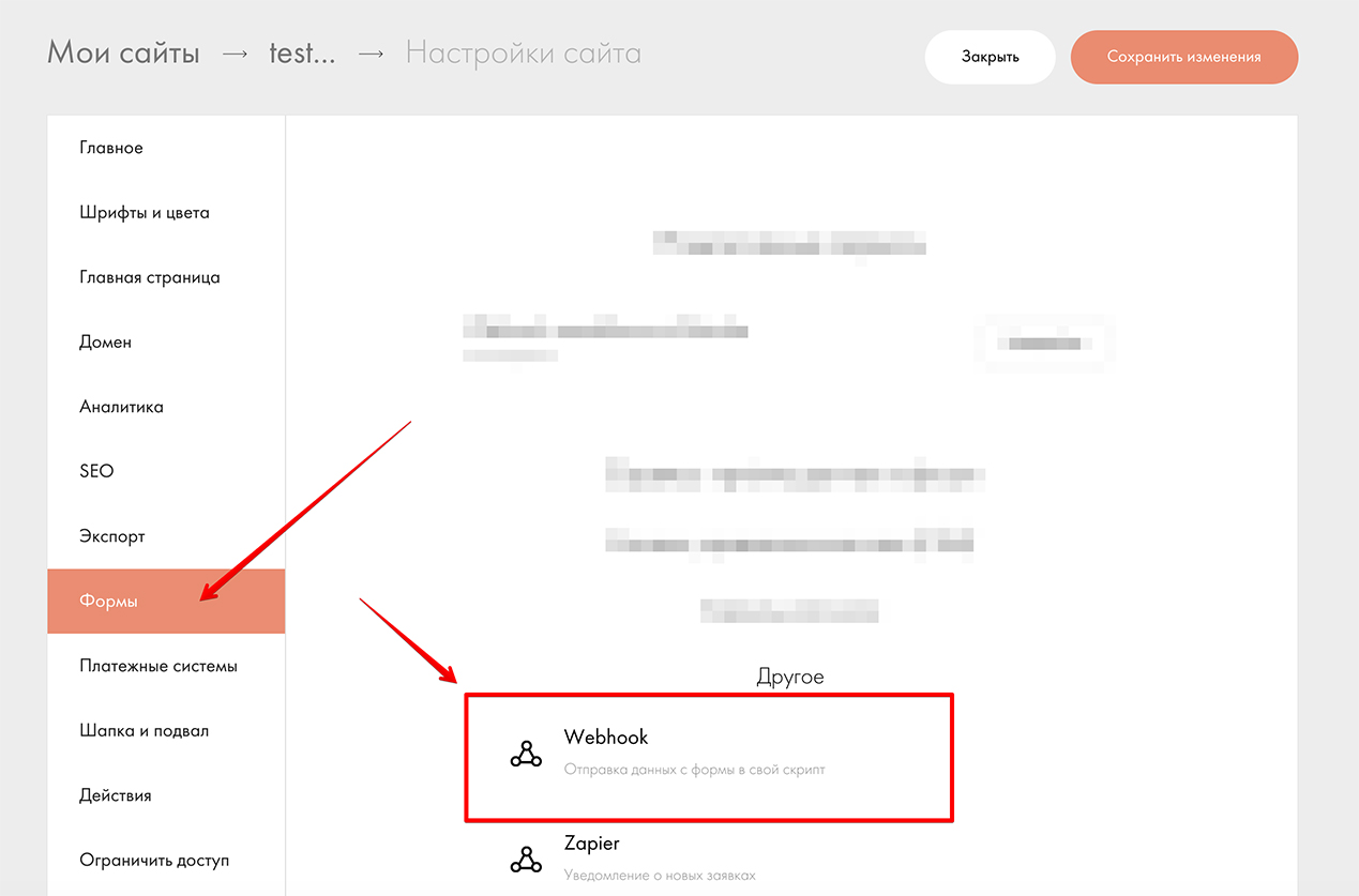 1. Перейдите в настройки вашего сайта в Tilda в раздел "Формы" и далее найдите опцию способа приёма данных "Webhook"