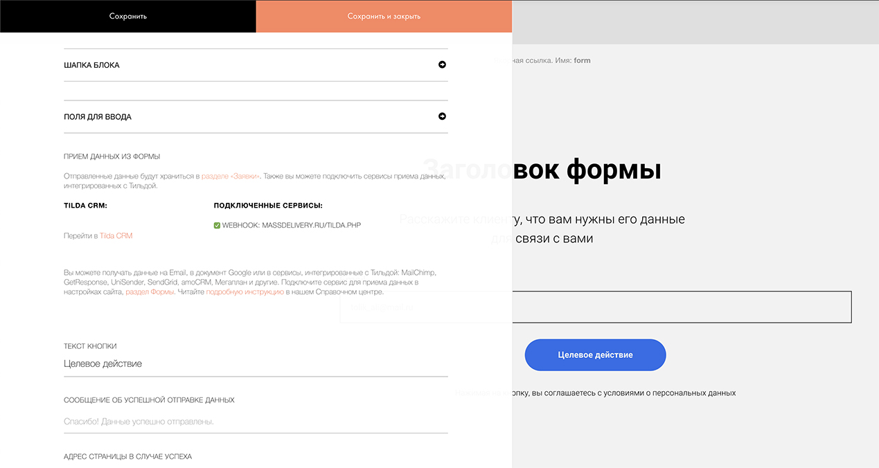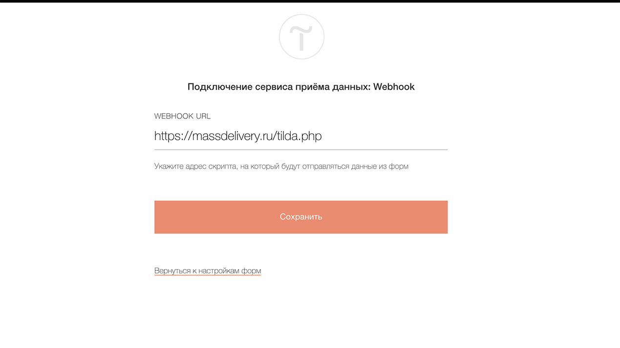 2. Скопируйте и вставьте в поле "WEBHOOK URL" следующий url - https://massdelivery.ru/tilda.php